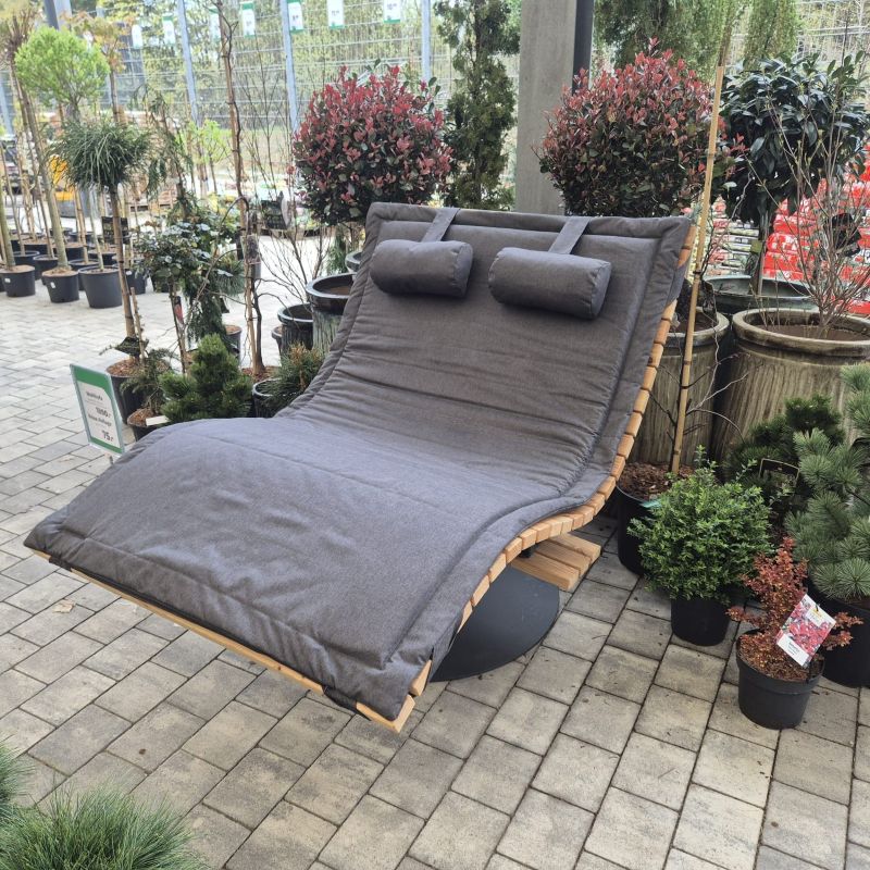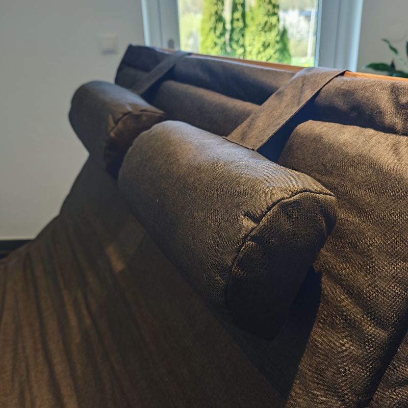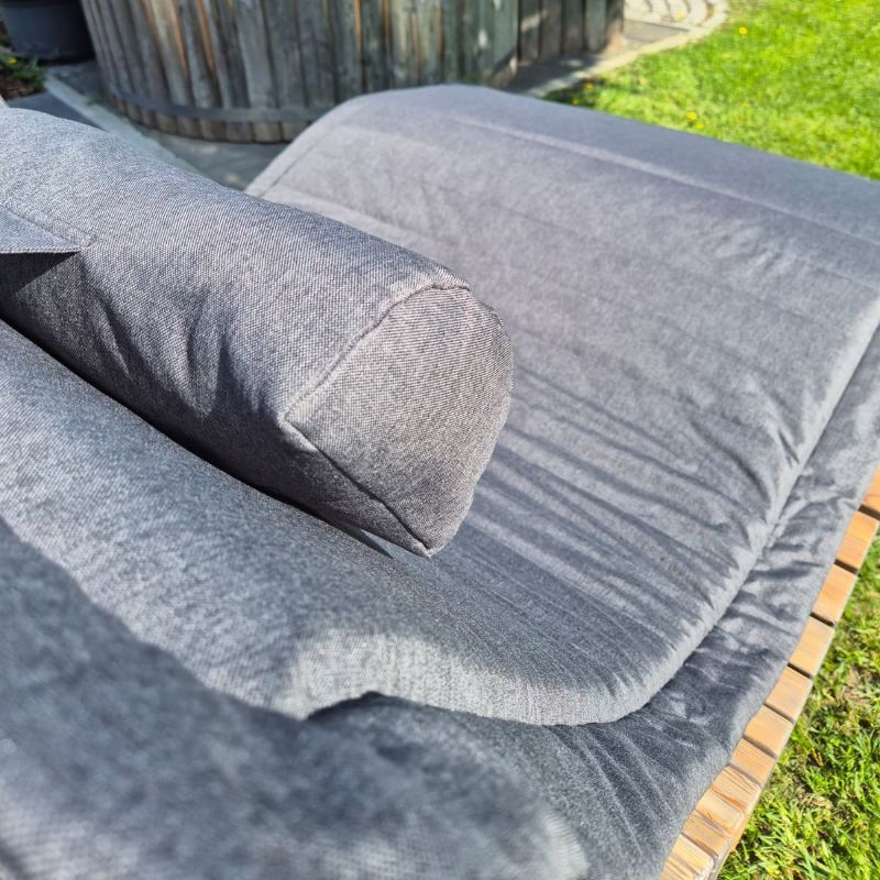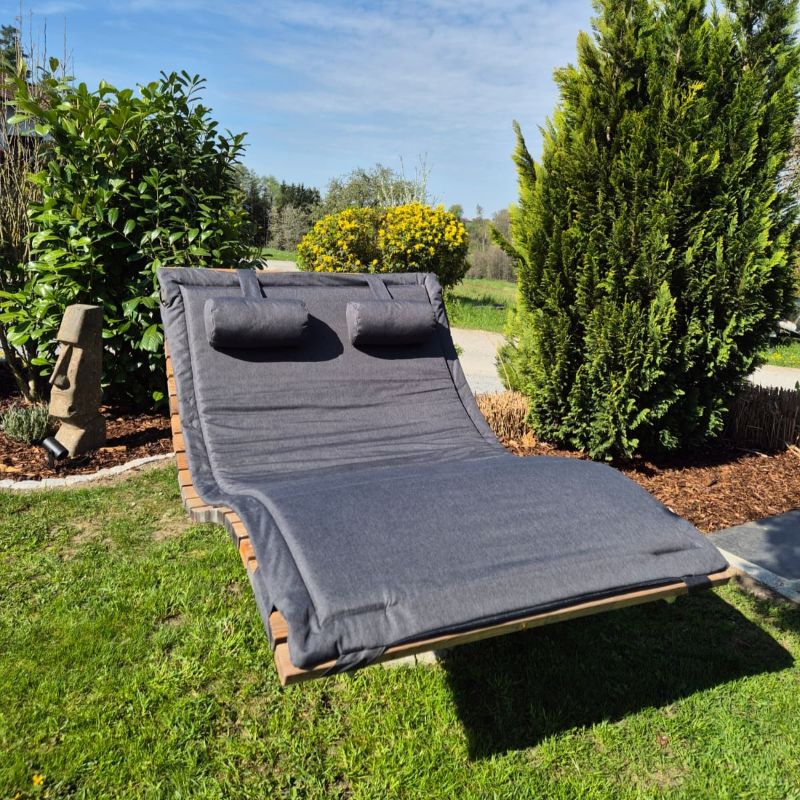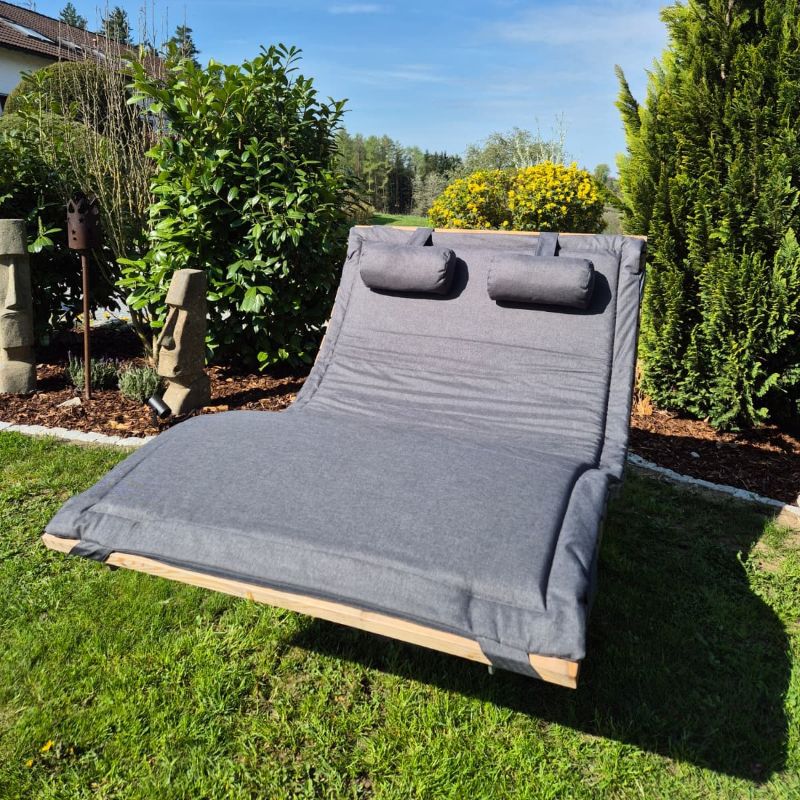 Die Auflage wird inklusive Kopfkissen geliefert. Dank der praktischen Schlaufenbänder bleibt das Kissen sicher an Ort und Stelle – auch bei Bewegung oder Wind.